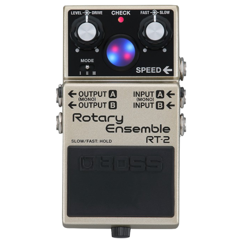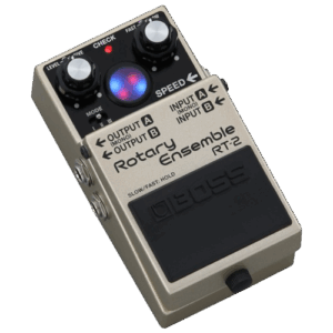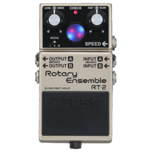 Boss RT-2 er gítarpedall sem líkir eftir hljómi klassískra snúningshátalara (rotary speakers), sem margir þekkja úr gömlum Hammond-orgelum og vintage hljómi. Pedallinn bætir hreyfingu og dýpt í tóninn og hentar vel í fjölbreytta tónlist.